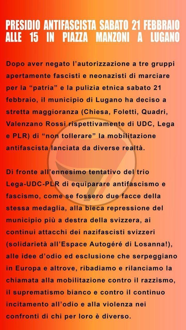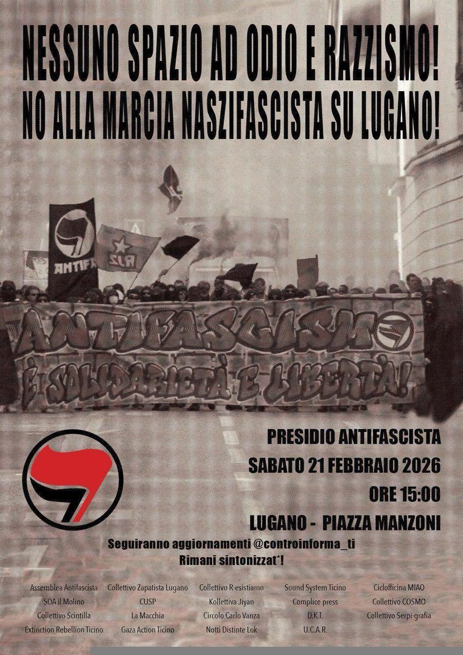 21 FEBBRAIO ORE 15 PIAZZA MANZONI LUGANO – PRESIDIO ANTIFASCISTA Posted on 20 Febbraio 202620 Febbraio 2026 by molino