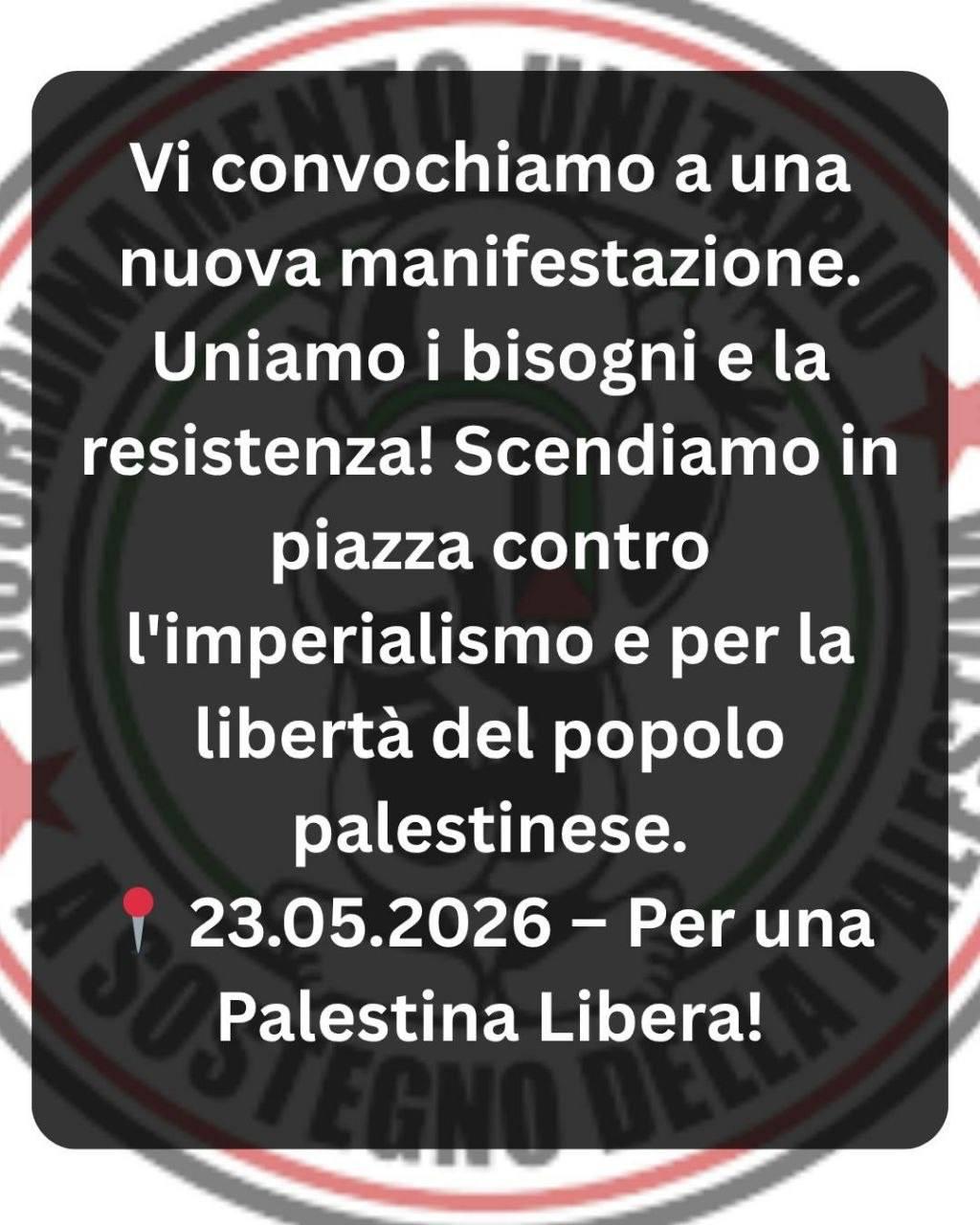 SABATO 23 MAGGIO – CORTEO contro l’imperialismo e per la libertà del popolo palestinese Posted on 12 Aprile 202624 Aprile 2026 by molino CUSP – Coordinamento unitario a sostegno della Palestina